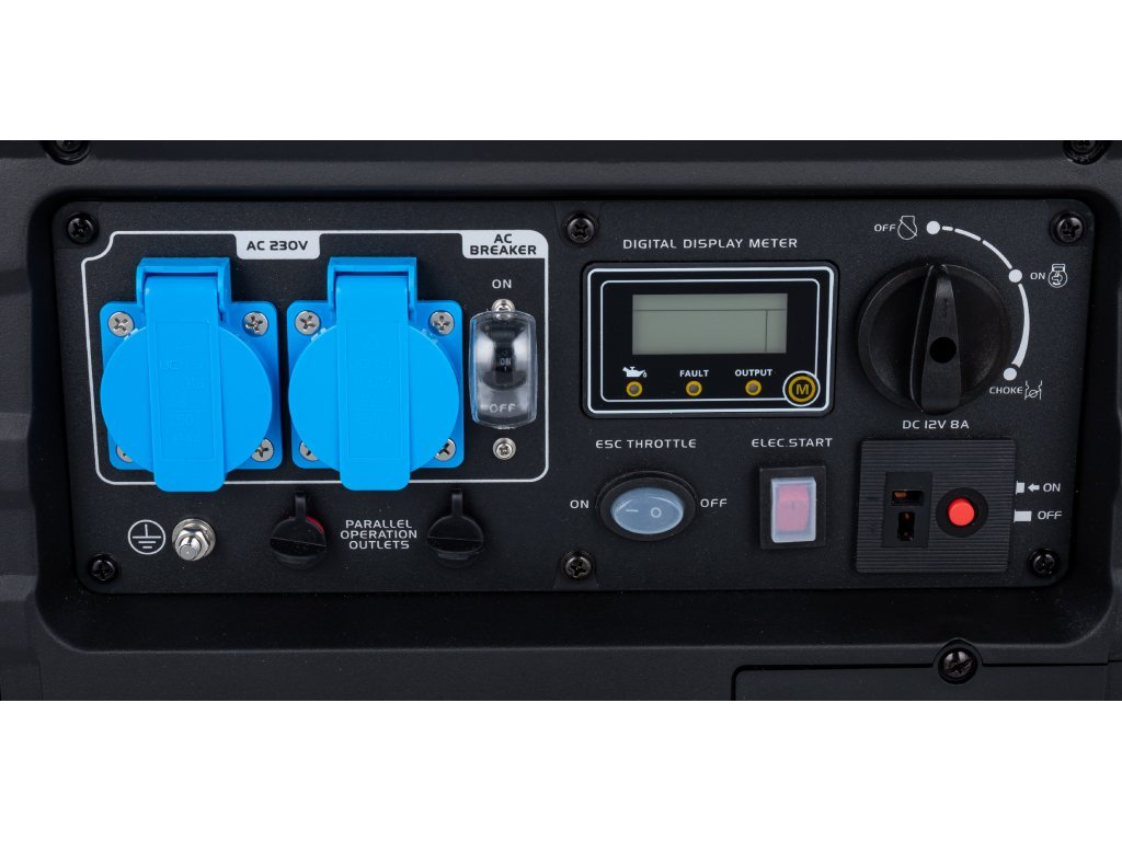 Toutes les fonctions du générateur sont faciles à gérer depuis un seul panneau. Tout est disposé de manière claire : protection contre la surcharge et les courts-circuits, protection contre le manque d’huile, bouton de réinitialisation pour le système de commande et la remise en service, connexion pour le raccordement parallèle de générateurs, bouton de démarrage et d’arrêt et prises.